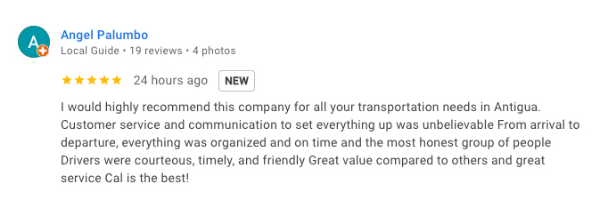 "I would highly recommend this company for all your transportation needs in Antigua. Customer service and communication to set everything up was unbelievable From arrival to departure, everything was organized and on time and the most honest group of people Drivers were courteous, timely, and friendly Great value compared to others and great service Cal is the best!"
